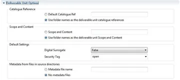 | -singledu | none | This option corresponds to the Structure Type, Single Deliverable Unit radio button. If set the generated SIP will only contain a single DU corresponding to the specified directory. DUs will not be created for child DUs effectively flattening any directory hierarchy present. |