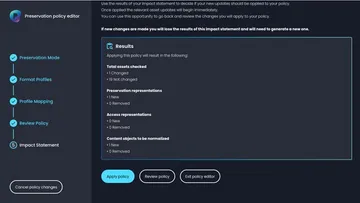 Because these settings now form a policy, and because automatically applying changes could trigger large numbers of migrations, Preservica will now require an Impact statement to be run. Doing this will save your changes as a draft policy and evaluate the impact of applying those changes (i.e. working out how many migrations would be triggered).